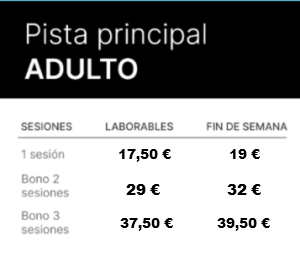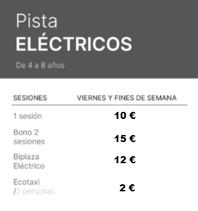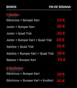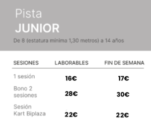 *Sesiones de 10 minutos. Bonos a usar por la misma persona y el mismo día en sesiones alternas. En el kart biplaza, el conductor tiene que ser mayor de 18 años.