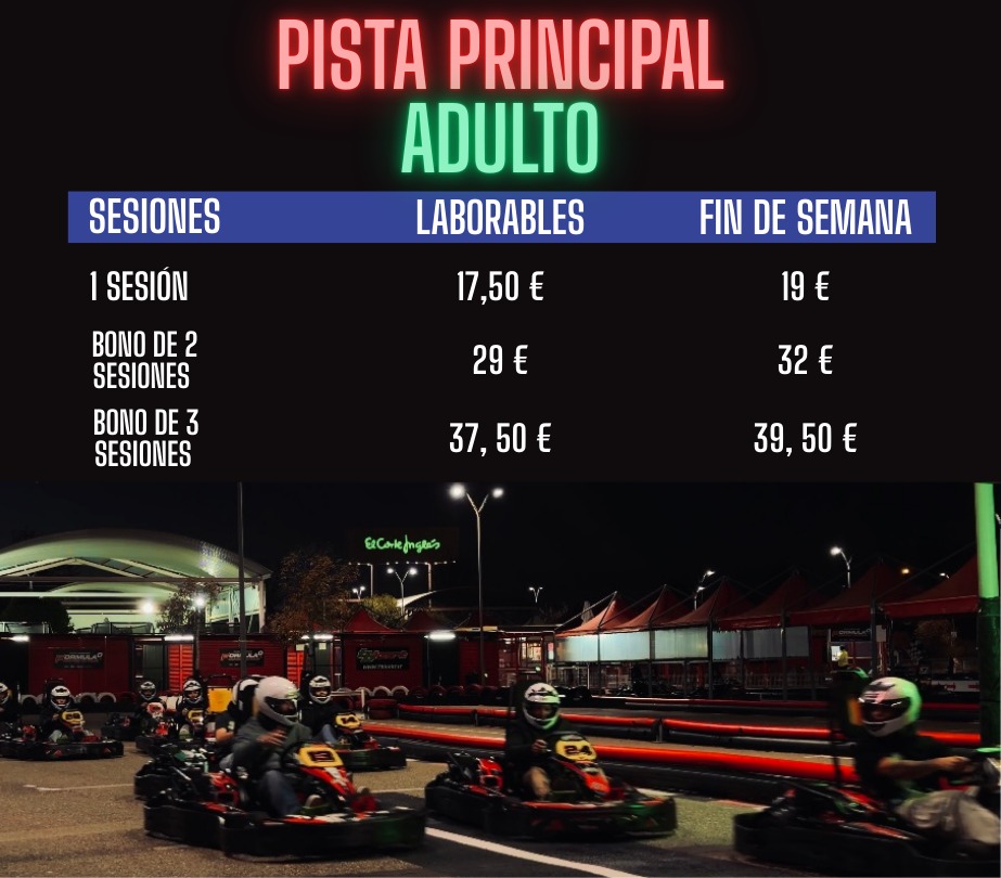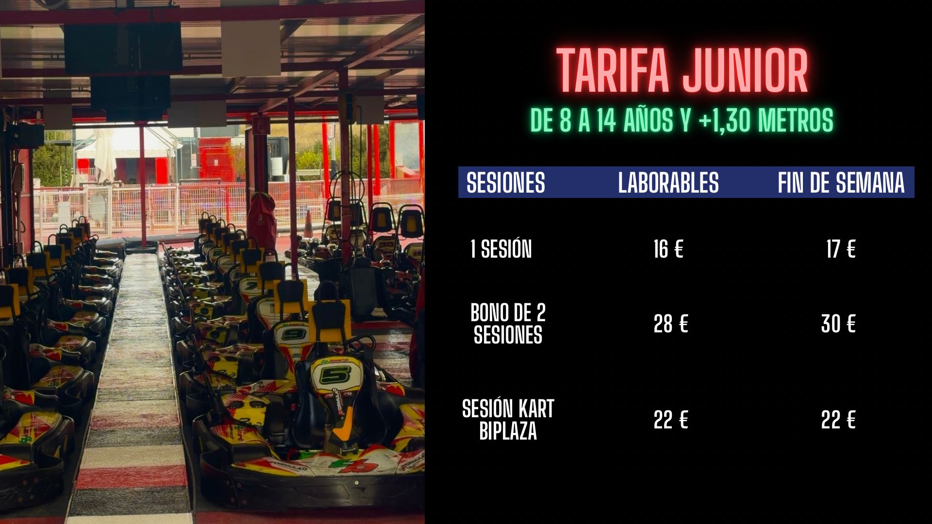 *Kart Junior, Biplaza y Adulto: Sesiones de 10 minutos. Kart Eléctrico: Sesiones de 7 minutos. Bono de 2 sesiones aplicable únicamente para el Kart Eléctrico. Bonos a usar por la misma persona y el mismo día.
